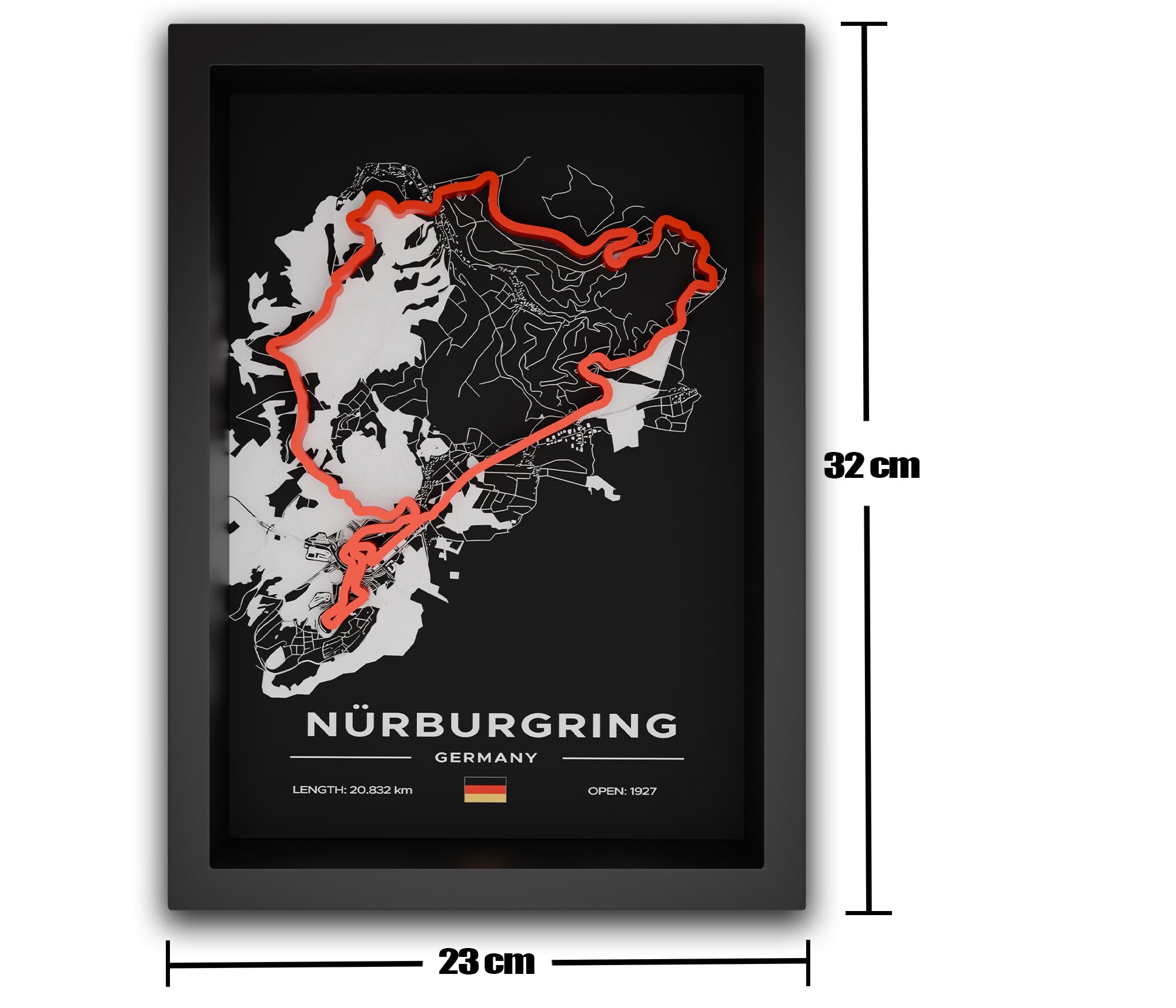 Dřevěný rámeček s průhlednou vrstvou a detailní mapou tratě. 3D vytisknutá silueta okruhu vytváří ohromující hloubkový efekt. Perfektní pro F1 fanoušky a milovníky motorsportu, kteří chtějí své oblíbené tratě vystavit jako umělecké dílo. Pečlivě zpracovaný kousek, který zdůrazní krásu každé tratě.